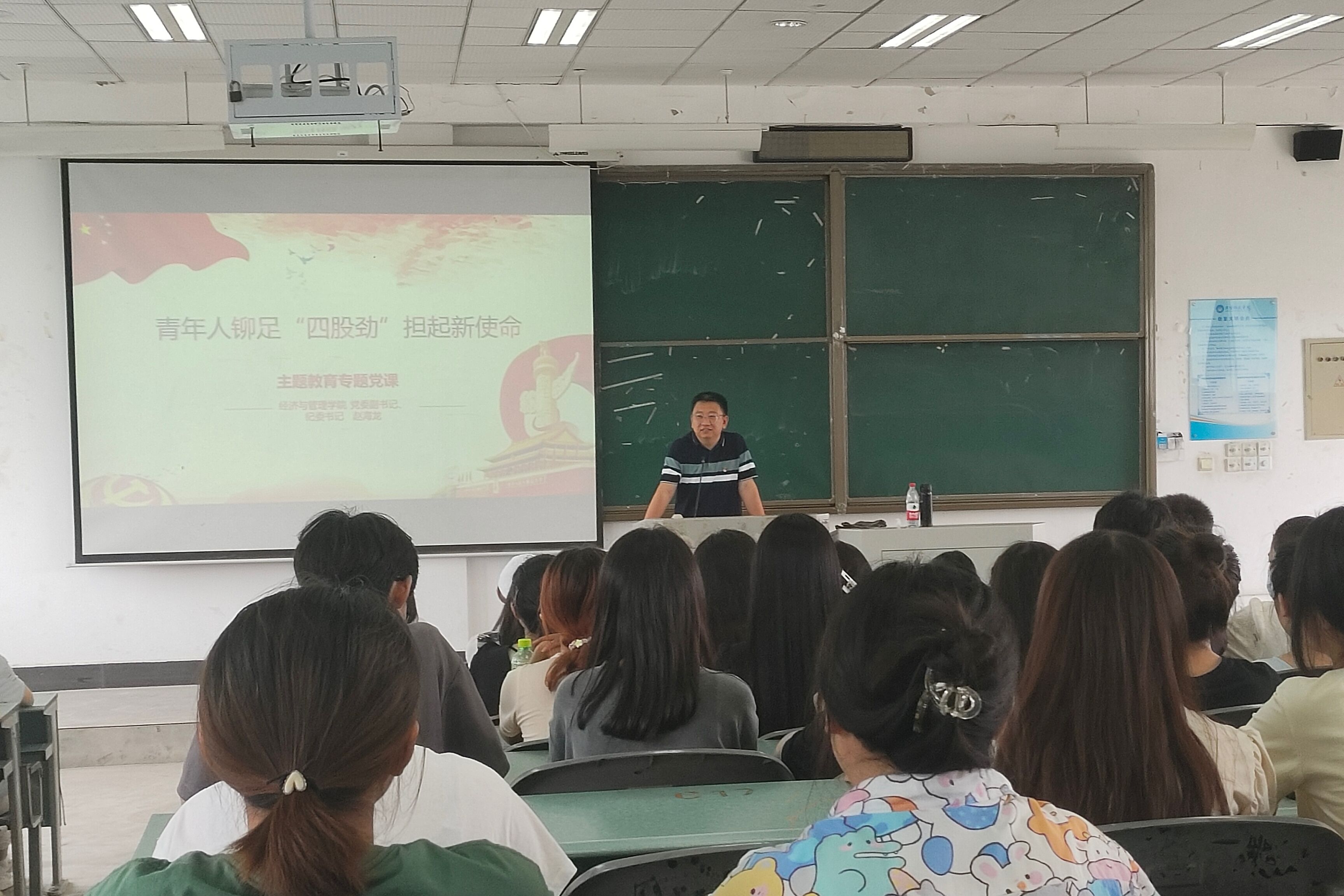 赵海龙以“青年人入党的初心和使命”为切入点,从青年人应铆足“千磨万击还坚劲”的韧劲、“百尺竿头更进一步”的闯劲、“直挂云帆济沧海”的拼劲、“吹尽狂沙始到金”的冲劲四个方面讲授党课。